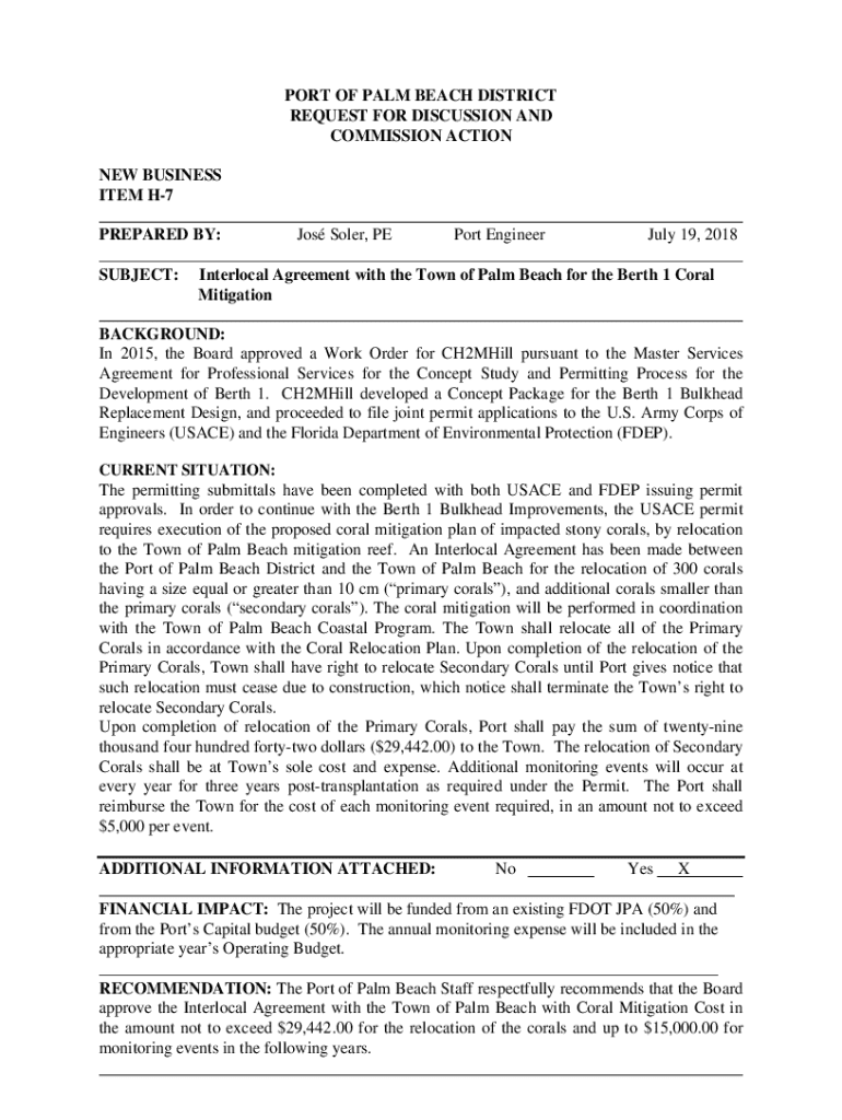 PORT OF PALM BEACH DISTRICT REQUEST FOR DISCUSSION AND COMMISSION ACTION NEW BUSINESS ITEM H7 PREPARED BY: Jos Soler, PE Port Engineer July 19, 2018 ___ SUBJECT: Interlocal Agreement with the Town