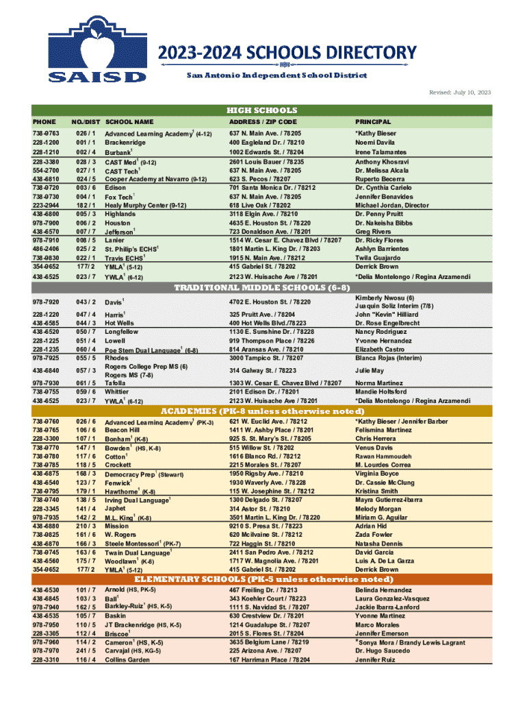 San Antonio Independent School District Revised: July 10, 2023HIGH SCHOOLS PHONE NO./DIST SCHOOL NAME 1ADDRESS / ZIP CODEPRINCIPAL7389763 2281200 2281210 2283380 5542700 4386810 7389720 7389730 2232944