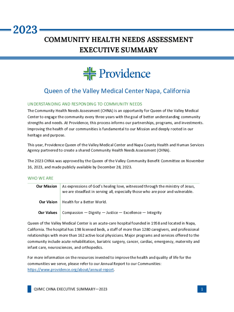 2023COMMUNITY HEALTH NEEDS ASSESSMENT EXECUTIVE SUMMARYQueen of the Valley Medical Center Napa, California UNDERSTANDING AND RESPONDING TO COMMUNITY NEEDS The Community Health Needs Assessment (CHNA)