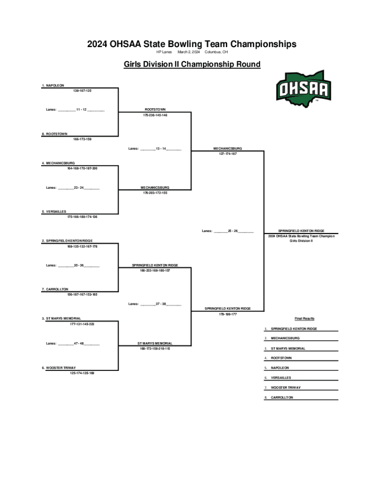 2024 OHSA State Bowling Team Championships HP Lanes March 2, 2024Columbus, Girls Division II Championship Round 1. NAPOLEON 139167125Lanes: ___ 11 12 ___POTTSTOWN 1752361451468. POTTSTOWN 166173159