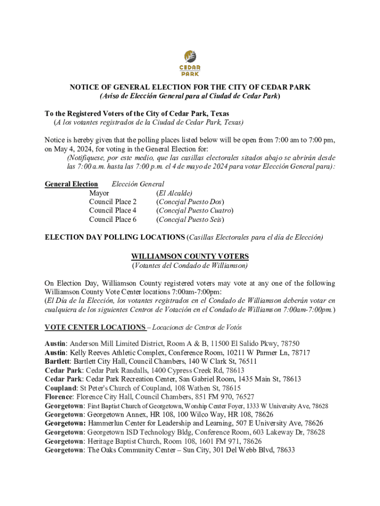 (Avis ode Eleccin General para all Ciudad de Cedar Park)