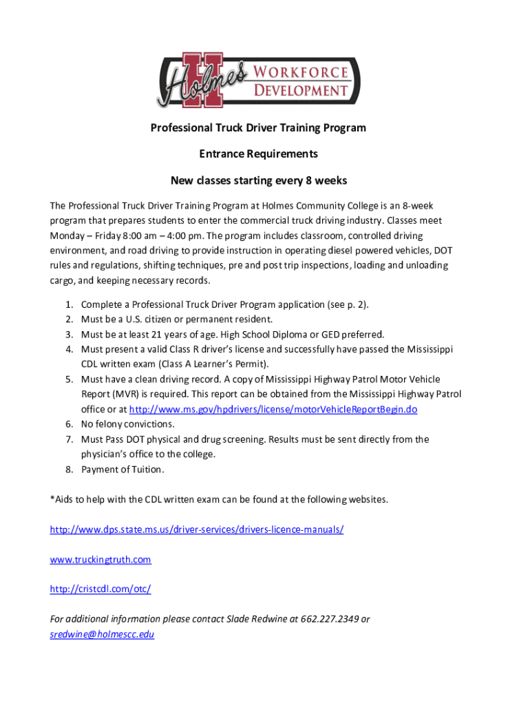 Professional Truck Driver Training Program Entrance Requirements New classes starting every 8 weeks The Professional Truck Driver Training Program at Holmes Community College is a 8week program that