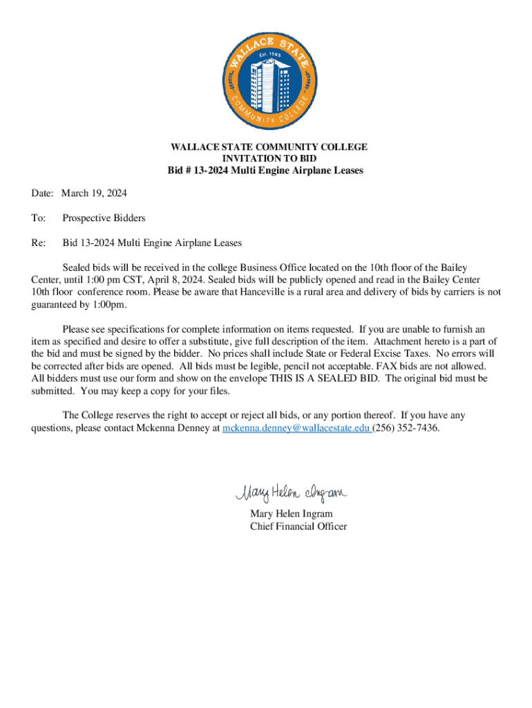 To:Prospective Bidders Re:Bid 132024 Multi Engine Airplane LeasesSealed bids will be