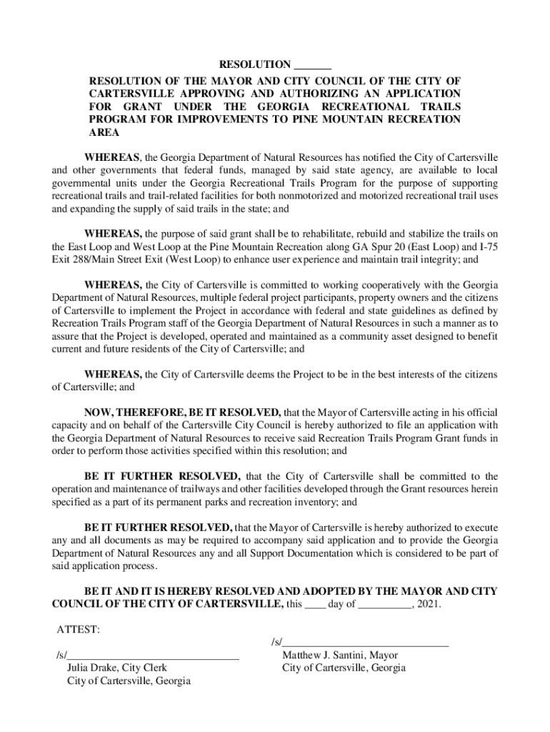 RESOLUTION ___ RESOLUTION OF THE MAYOR AND CITY COUNCIL OF THE CITY OF CARTERSVILLE APPROVING AND AUTHORIZING AN APPLICATION FOR GRANT UNDER THE GEORGIA RECREATIONAL TRAILS PROGRAM FOR IMPROVEMENTS