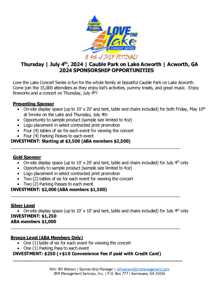 Thursday | July 4th, 2024 | Cauble Park on Lake Acworth | Acworth, GA 2024 SPONSORSHIP OPPORTUNITIES Love the Lake Concert Series is fun for the whole family at beautiful Cauble Park on Lake Acworth.