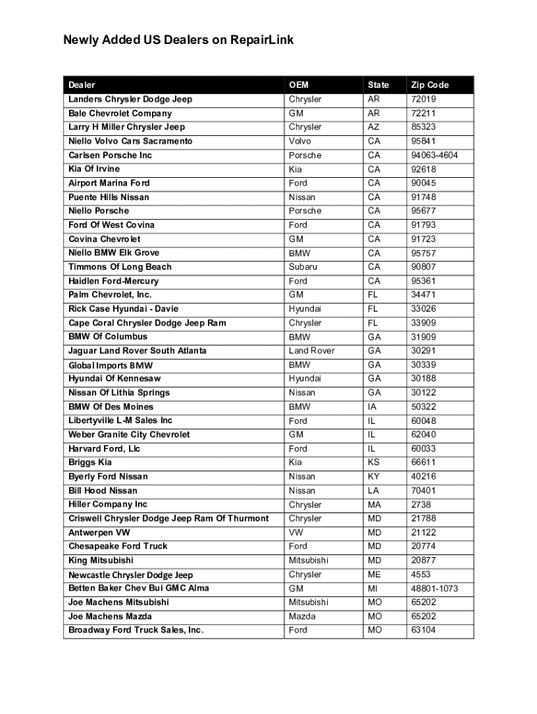 DealerOEMStateZip Colanders Chrysler Dodge JeepChryslerAR72019Bale Chevrolet CompanyGMAR72211Larry H Miller Chrysler JeepChryslerAZ85323Niello Volvo Cars SacramentoVolvoCA95841Carlsen