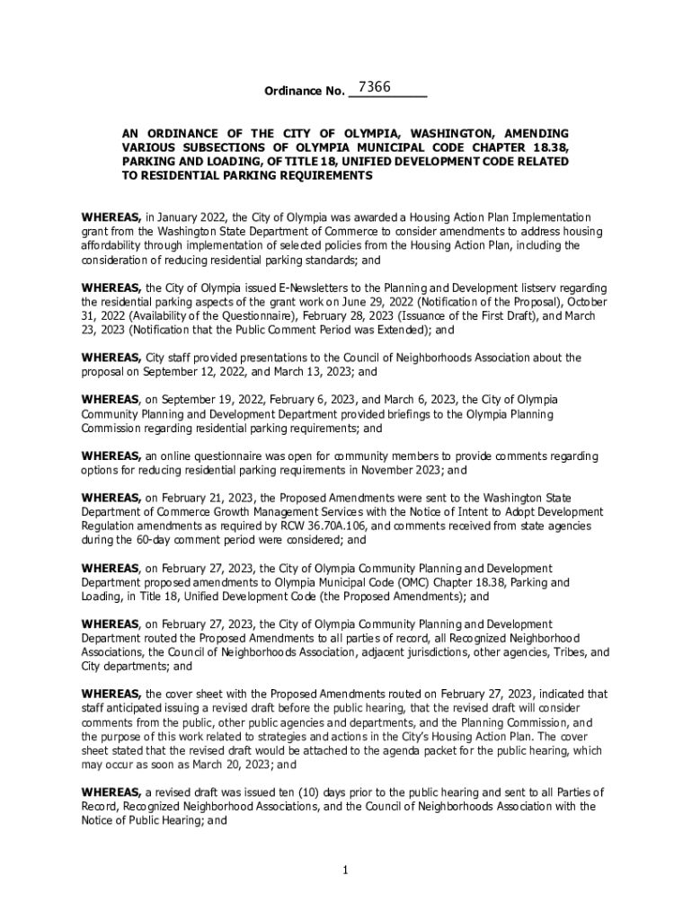 Ordinance No.7366AN ORDINANCE OF THE CITY OF OLYMPIA, WASHINGTON, AMENDING VARIOUS SUBSECTIONS OF OLYMPIA MUNICIPAL CODE CHAPTER 18.38, PARKING AND LOADING, OF TITLE 18, UNIFIED DEVELOPMENT CODE RELATED