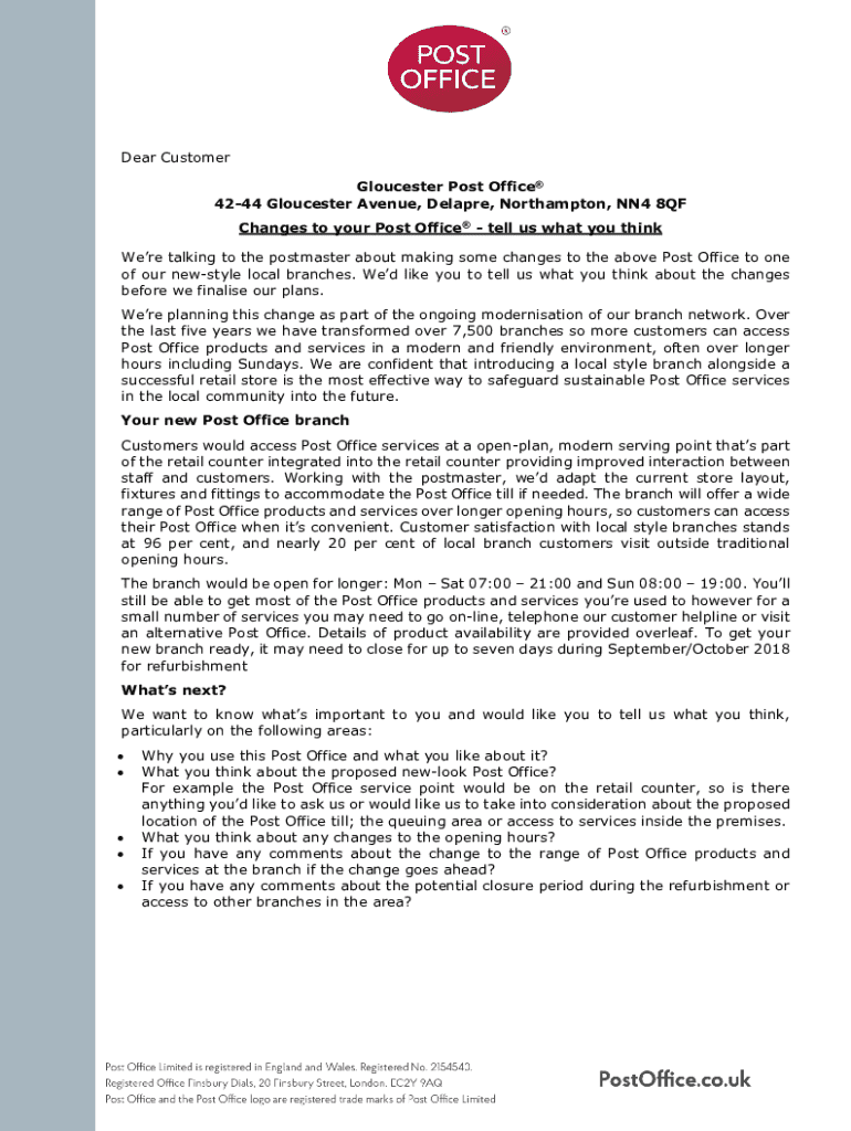 Dear Customer Gloucester Post Office 4244 Gloucester Avenue, Delapre, Northampton, NN4 8QF Changes to your Post Office tell us what you think Were talking to the postmaster about making some changes