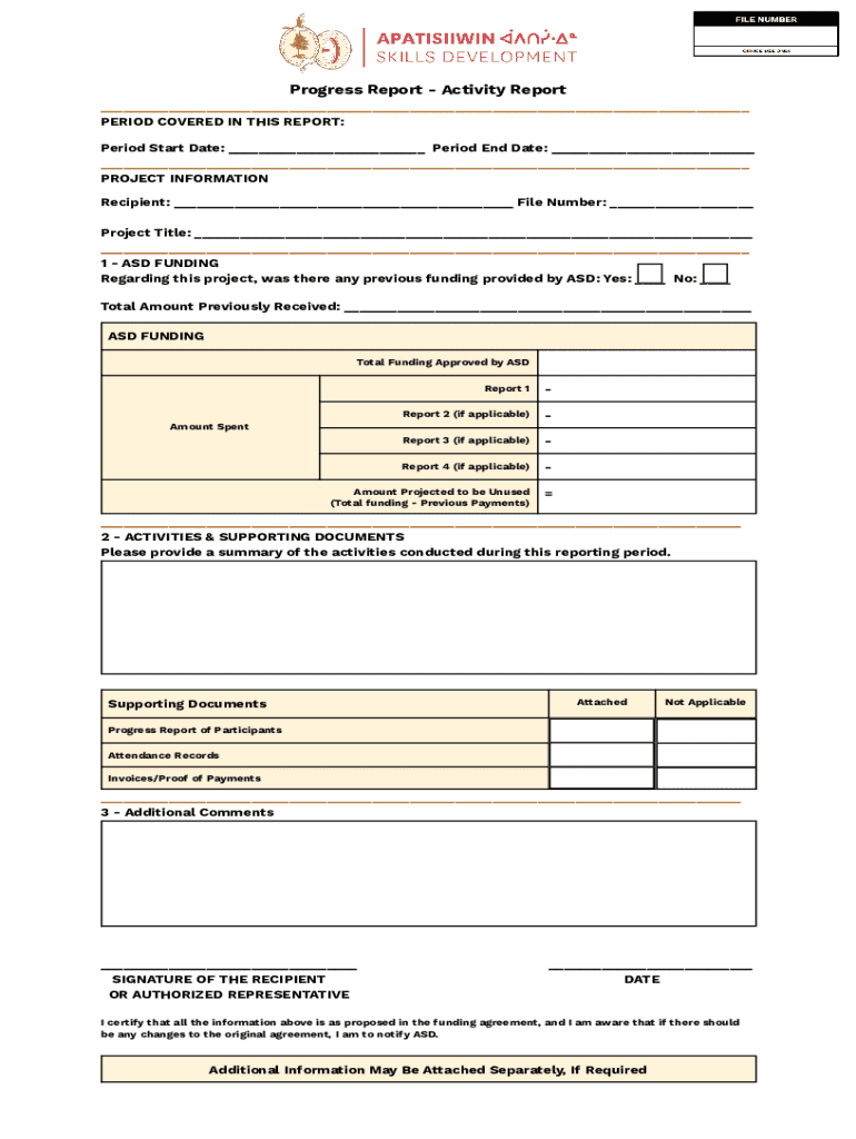 Progress Report Activity Report ___ PERIOD COVERED IN THIS REPORT: Period Start Date: ___ Period End Date: ___ ___ PROJECT INFORMATION Recipient: ___ File Number: ___ Project Title: ___ ___ 1 ASD