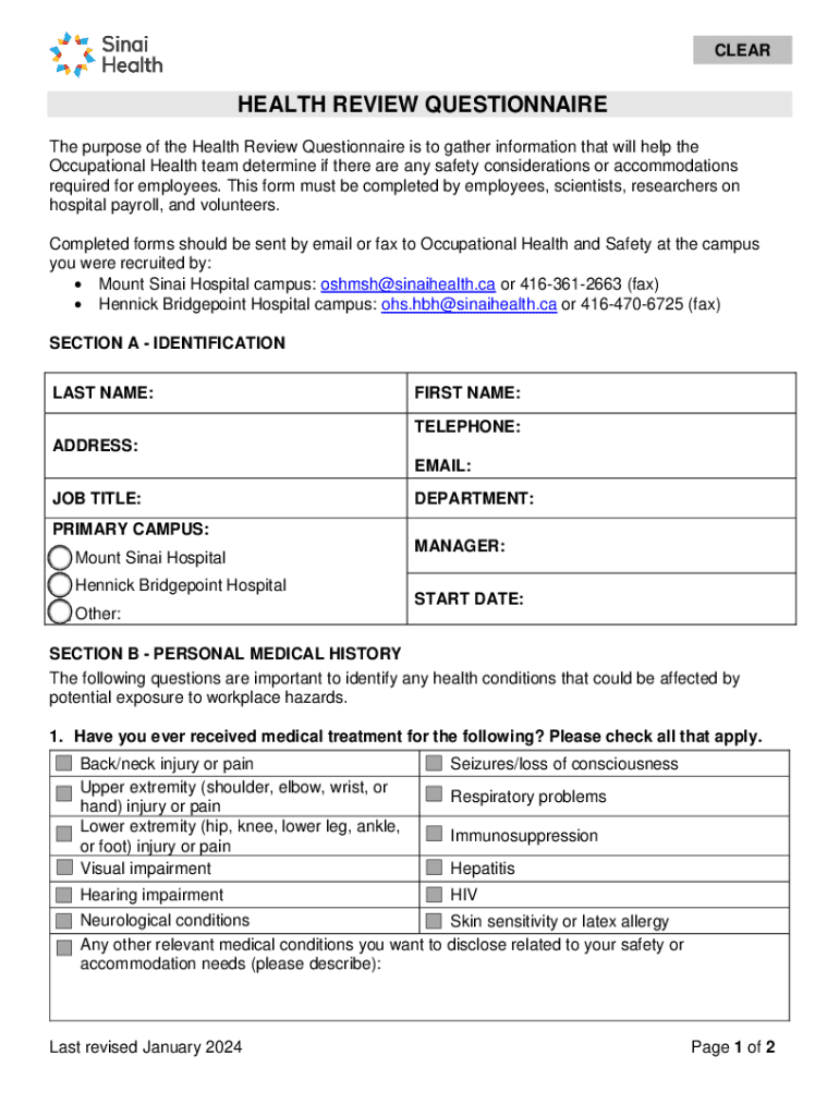 CLEARHEADED REVIEW QUESTIONNAIRE The purpose of the Health Review Questionnaire is to gather information that will help the Occupational Health team determine if there are any safety considerations