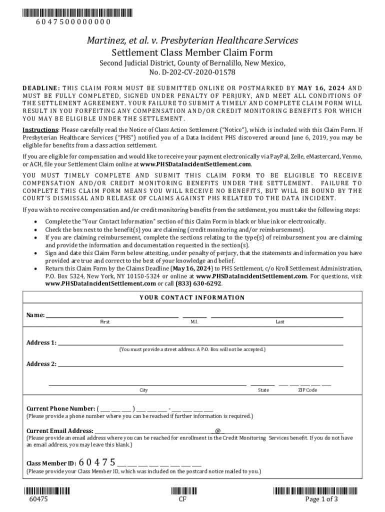 *6047500000000* 6047500000000Martinez, et al. v. Presbyterian Healthcare Services Settlement Class Member Claim Form Second Judicial District, County of Bernalillo, New Mexico, No. D202CV202001578