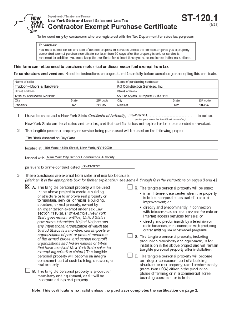 Department of Taxation and Finance York State and Local Sales and Use Contractor Exempt Purchase CertificateST120.1(9/21)To be used only by contractors who are registered with the Tax Department for