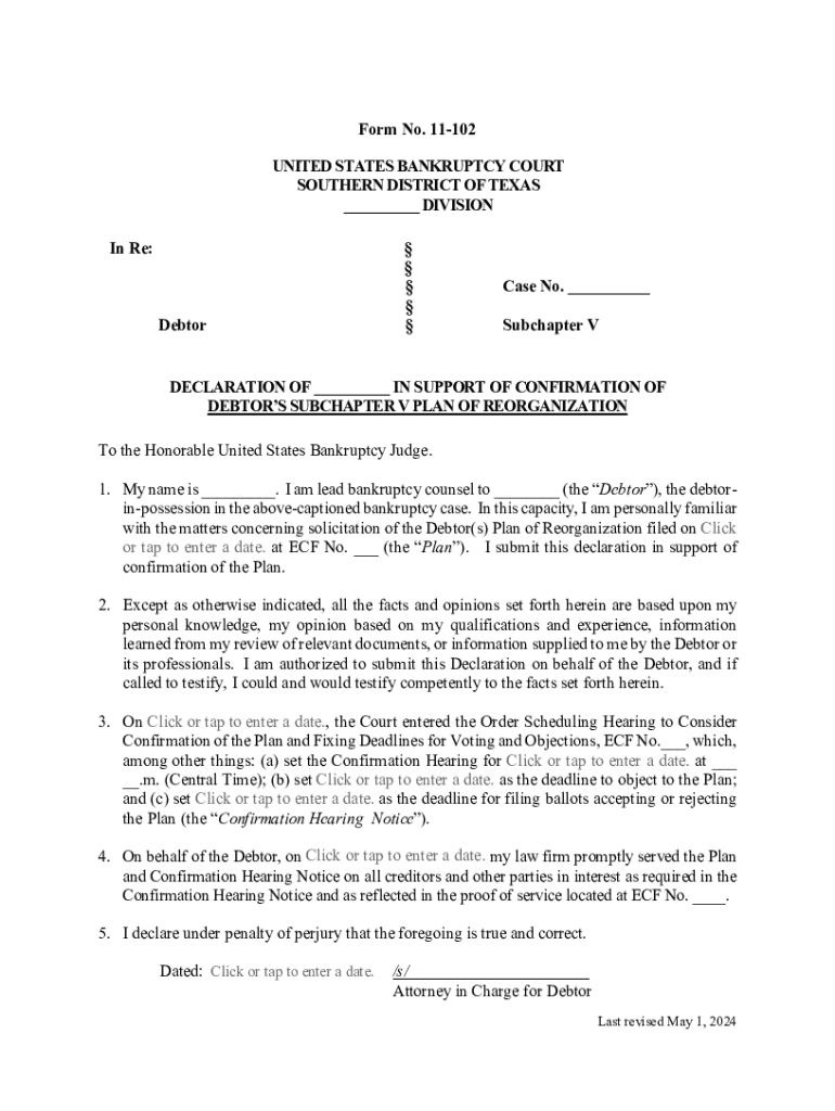Form No. 11102 UNITED STATES BANKRUPTCY COURT SOUTHERN DISTRICT OF TEXAS ___ DIVISION In Re:Debtor Case No. ___ Subchapter DECLARATION OF ___ IN SUPPORT OF CONFIRMATION OF DEBTORS SUBCHAPTER V PLAN