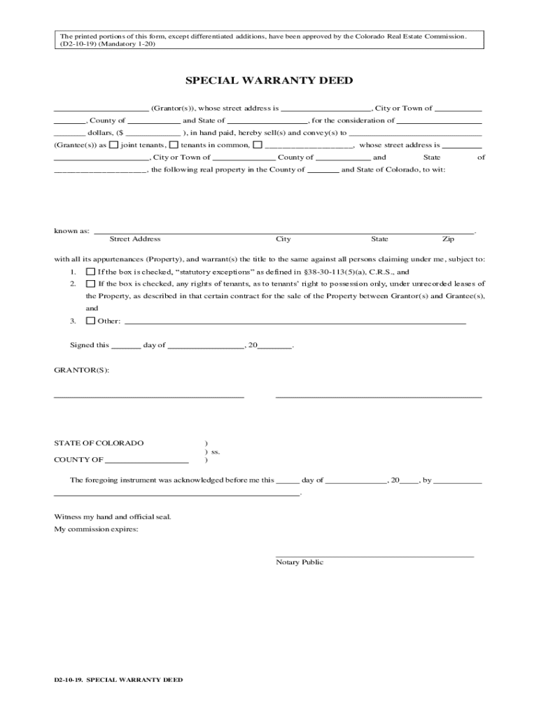 The printed portions of this form, except differentiated additions, have been approved by the Colorado Real Estate Commission. (D21019) (Mandatory 120)SPECIAL WARRANTY DEED (Granter(s)), whose street