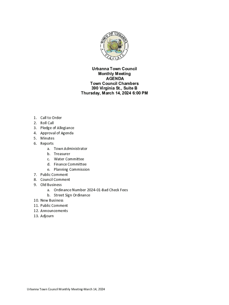 Urbana Town Council Monthly Meeting AGENDA Town Council Chambers 390 Virginia St., Suite B Thursday, March 14, 2024 6:00 PM1. 2. 3. 4. 5. 6.7. 8. 9. 10. 11. 12. 13. Call to Order Roll Call Pledge