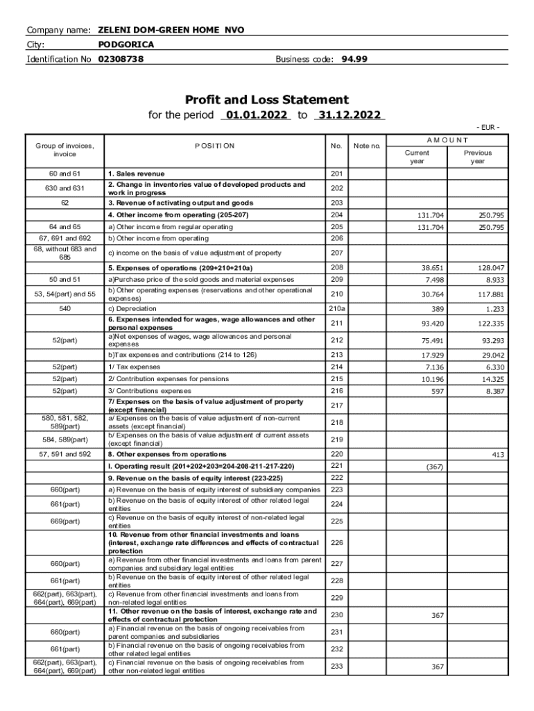 City:PODGORICAIdentification No 02308738Business code: 94.99Profit and Loss Statement