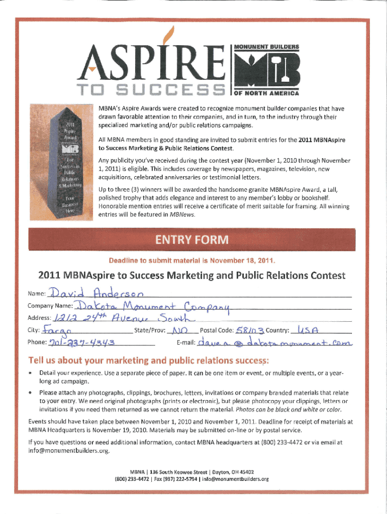 PTO SUCCESSOR NORTH AMERICANA\'s Aspire Awards were created to recognize monument builder companies that have drawn favorable attention to their companies, and in turn, to the industry through their