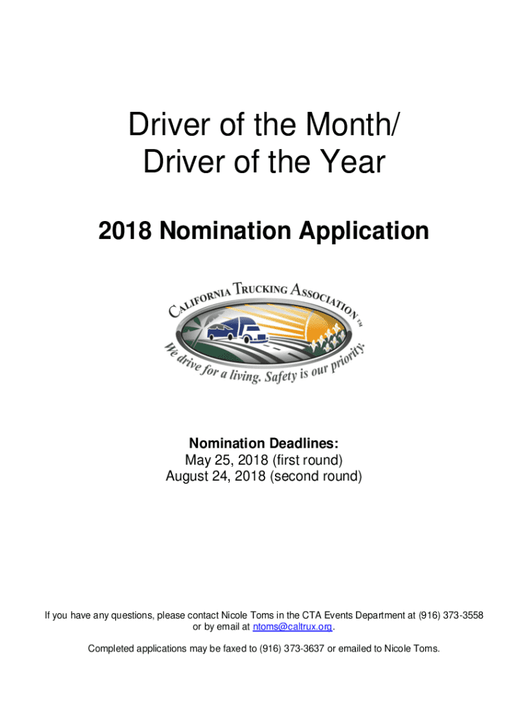 Driver of the Month/ Driver of the Year 2018 Nomination ApplicationNomination Deadlines: May 25, 2018 (first round) August 24, 2018 (second round)If you have any questions, please contact Nicole Toms