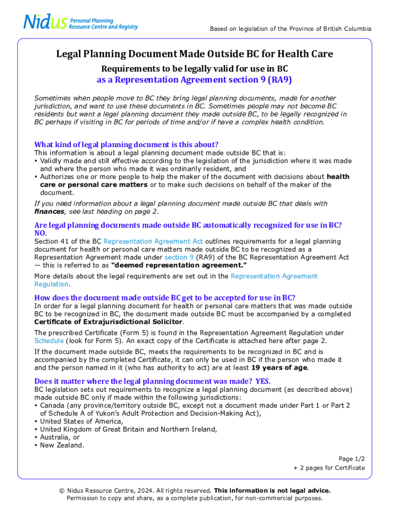 Based on legislation of the Province of British ColumbiaLegal Planning Document Made Outside BC for Health Care