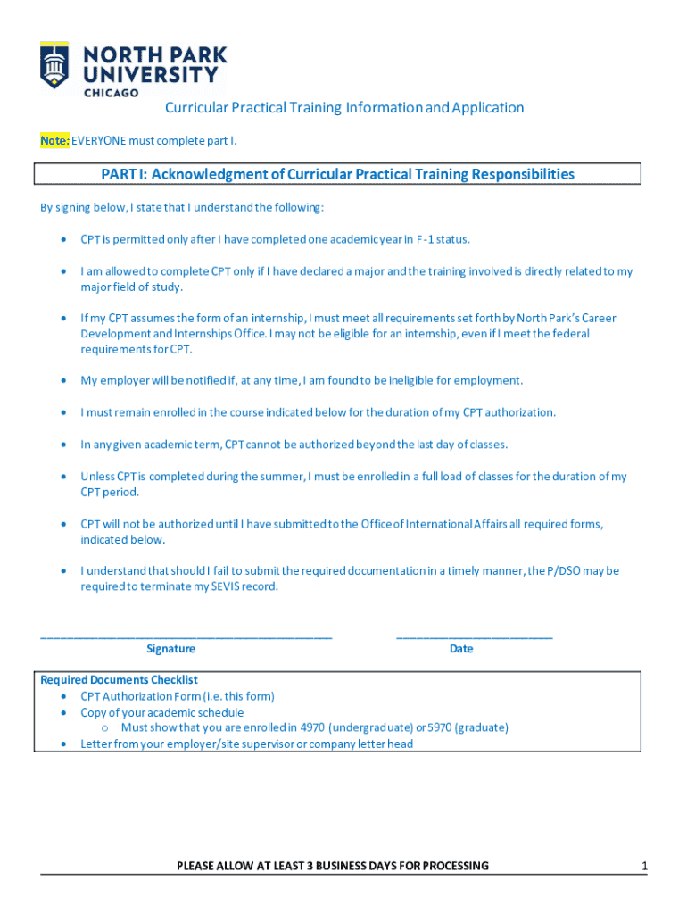 Curricular Practical Training Information and Application Note: EVERYONE must complete part I.PART I: Acknowledgment of Curricular Practical Training Responsibilities By signing below, I state that