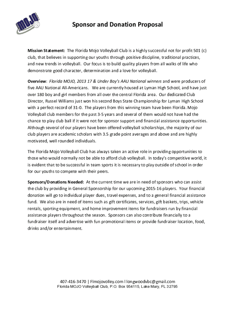Sponsor and Donation ProposalMission Statement: The Florida Mojo Volleyball Club is a highly successful not for profit 501 (c) club, that believes in supporting our youths through positive discipline,