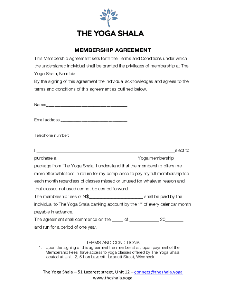 MEMBERSHIP AGREEMENT This Membership Agreement sets forth the Terms and Conditions under which the undersigned individual shall be granted the privileges of membership at The Yoga Sheila, Namibia.
