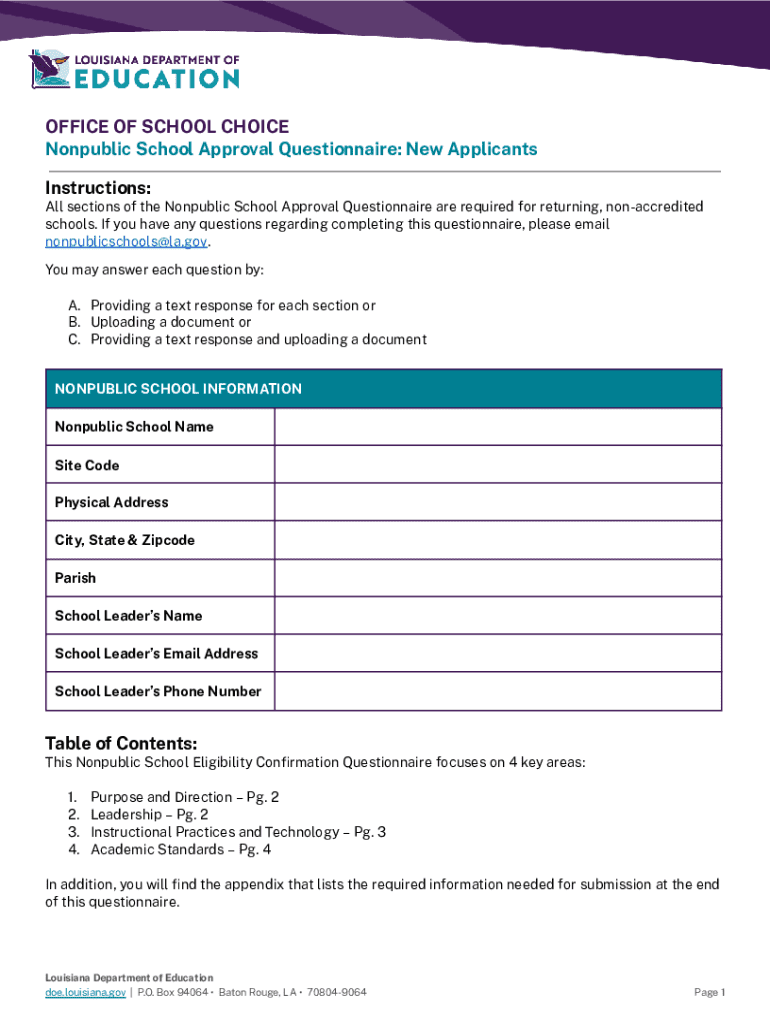 All sections of the Nonpublic School Approval Questionnaire are required for returning, nonaccredited