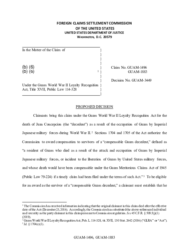 FOREIGN CLAIMS SETTLEMENT COMMISSION OF THE UNITED STATES DEPARTMENT OF JUSTICE WASHINGTON, D.C. 20579In the Matter of the Claim of (b) (6) 1 (b) (6) Under the Guam World War II Loyalty Recognition