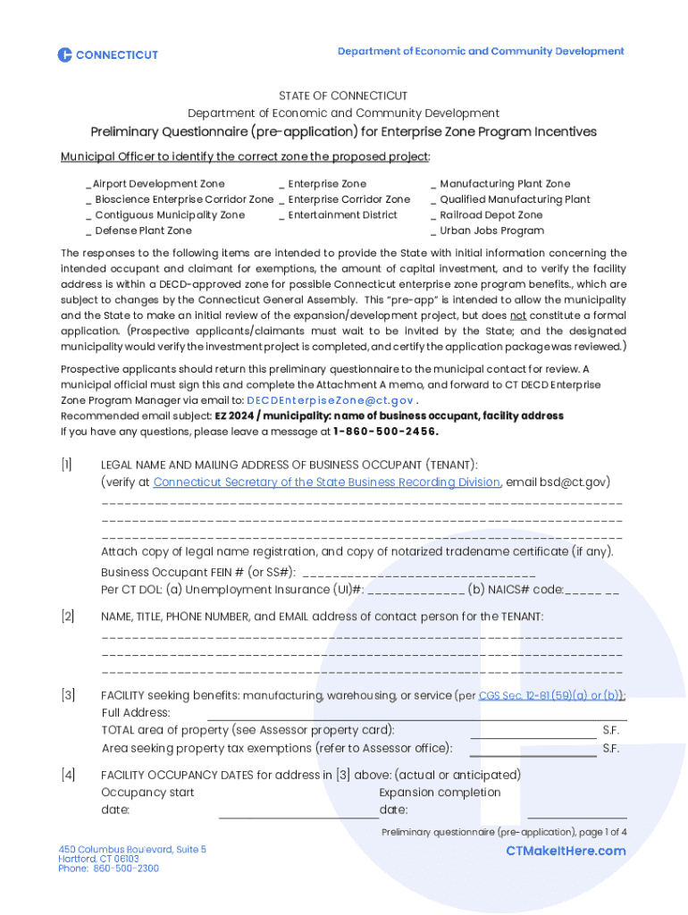STATE OF CONNECTICUT Department of Economic and Community DevelopmentPreliminary Questionnaire (reapplication) for Enterprise Zone Program Incentives Municipal Officer to identify the correct zone
