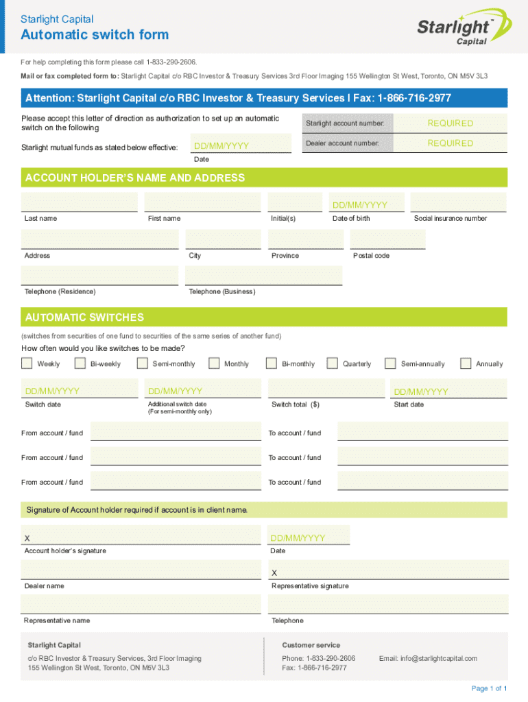Starlight CapitalAutomatic switch form For help completing this form please call 18332902606. Mail or fax completed form to: Starlight Capital c/o RBC Investor & Treasury Services 3rd Floor Imaging