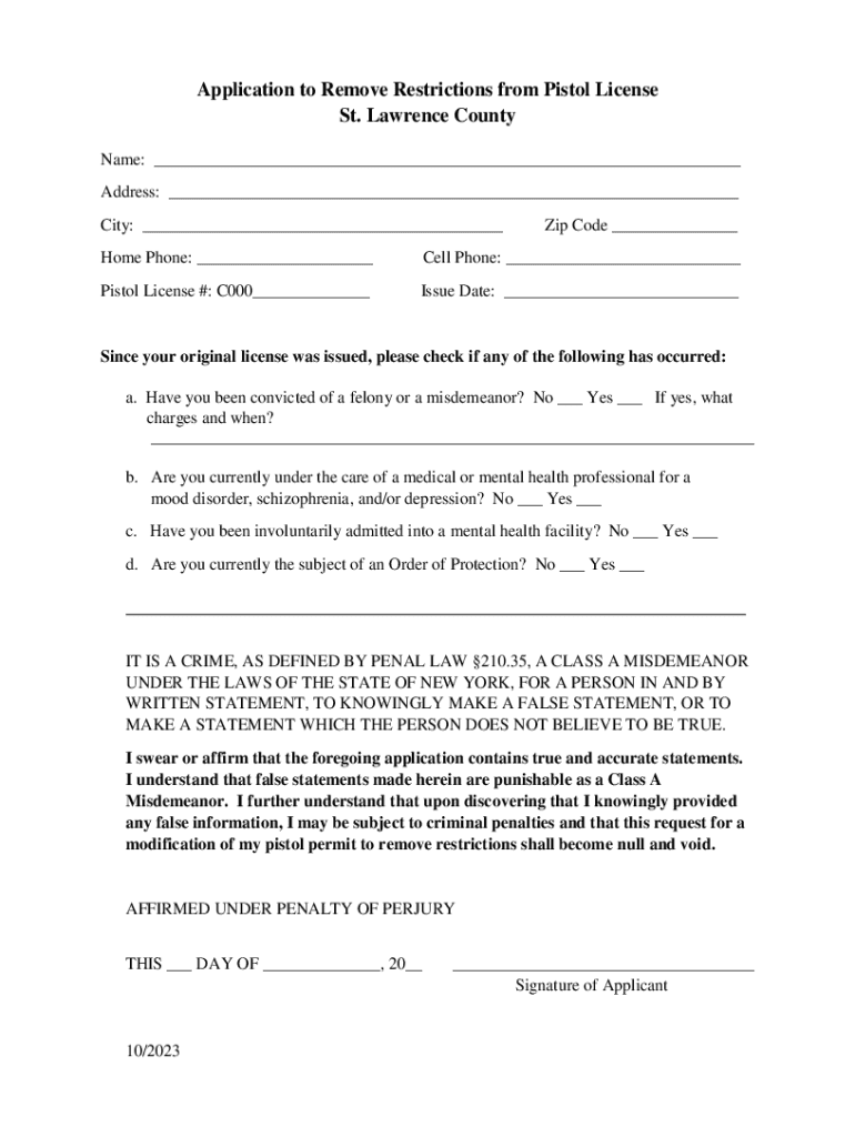 Get the free Application to Remove Restrictions from Pistol License