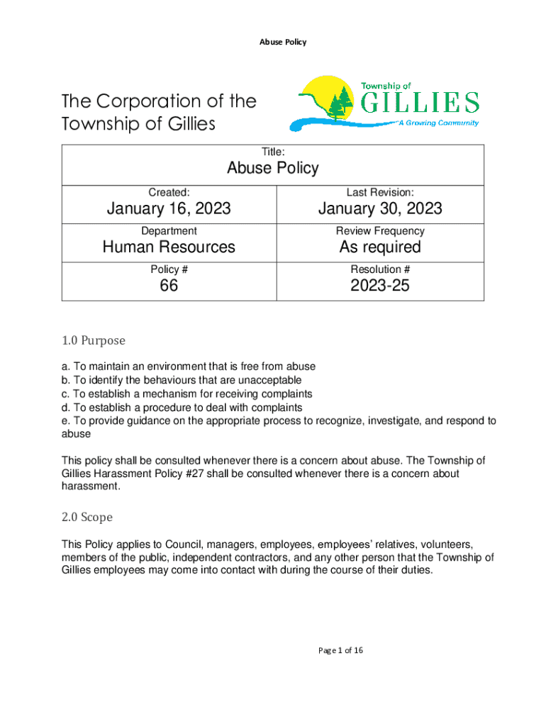 Created:Last Revision:January 16, 2023January 30, 2023DepartmentReview FrequencyHuman Resources As requiredPolicy #Resolution