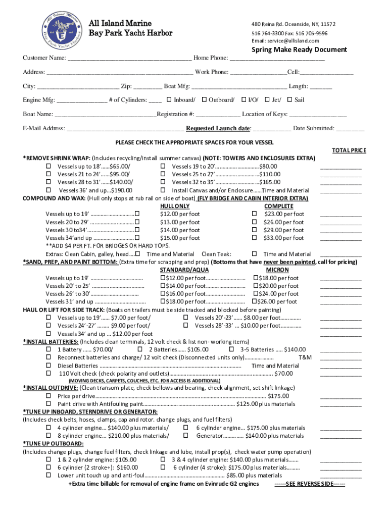 All Island Marine Bay Park Yacht Harbor480 Reina Rd. Oceanside, NY, 11572 516 7643300 Fax: 516 7059596 Email: service@allisland.comSpring Make Ready Document Customer Name: ___ Home Phone: ___ Address: