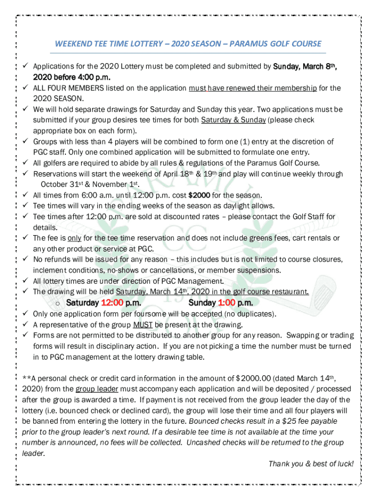 WEEKEND TEE TIME LOTTERY 2020 SEASON PARAMUS GOLF COURSE Applications for the 2020 Lottery must be completed and submitted by Sunday, March 8th, 2020 before 4:00 p.m. ALL FOUR MEMBERS listed on the