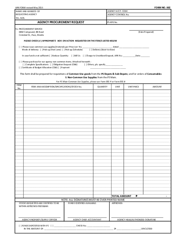 PH Procurement Service Agency Procurement Request 2015 free printable template