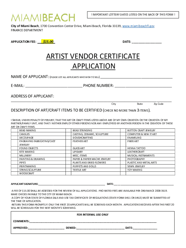 ! IMPORTANT LOTTERY DATES LISTED ON THE BACK OF THIS FORM ! City of Miami Beach, 1700 Convention Center Drive, Miami Beach, Florida 33139, www.miamibeachfl.gov FINANCE DEPARTMENT APPLICATION FEE: