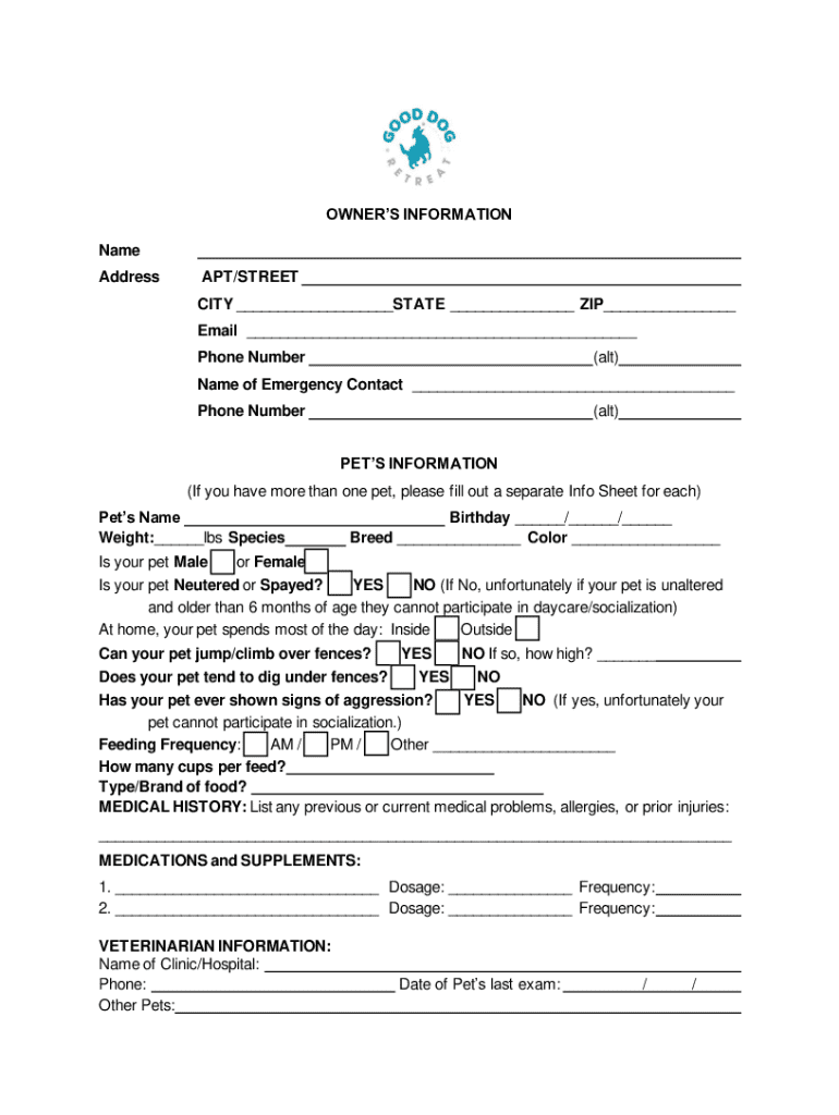OWNERS INFORMATION Name Address APT/STREET CITY ___STATE ___ ZIP___ Email ___ Phone Number(alt)Name of Emergency Contact ___ Phone Number(alt) PETS INFORMATION(If you have more than one pet, please