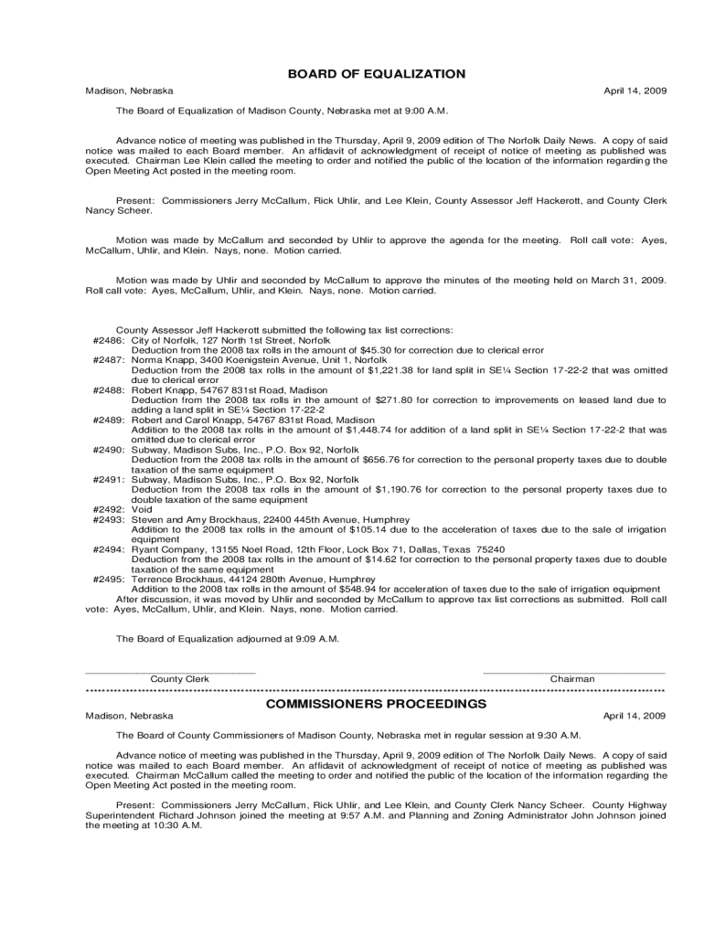 BOARD OF EQUALIZATION Madison, NebraskaApril 14, 2009The Board of Equalization of Madison County, Nebraska met at 9:00 A.M.Advance notice of meeting was published in the Thursday, April 9, 2009 edition