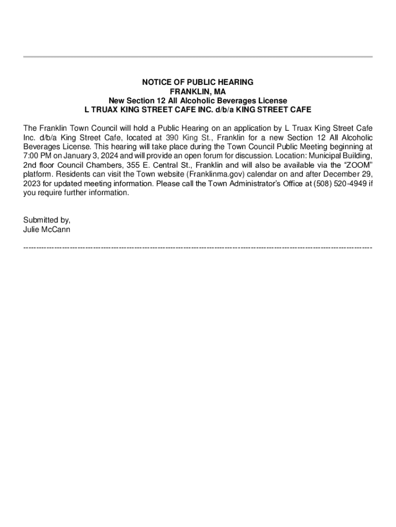 Get the free Notice of Public Hearing - New Section 12 All Alcoholic ...