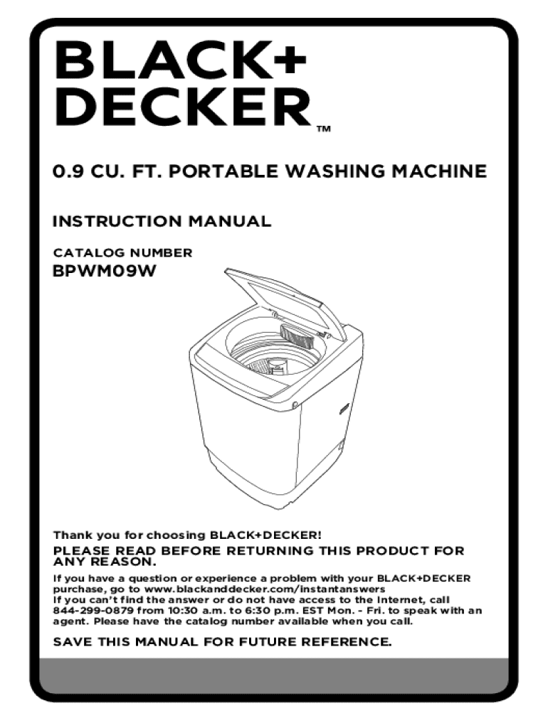 0.9 CU. FT. PORTABLE WASHING MACHINE INSTRUCTION MANUAL CATALOG NUMBERBPWM09WThank you for choosing BLACK+DECKER!PLEASE READ BEFORE RETURNING THIS PRODUCT FOR ANY REASON. If you have a question or