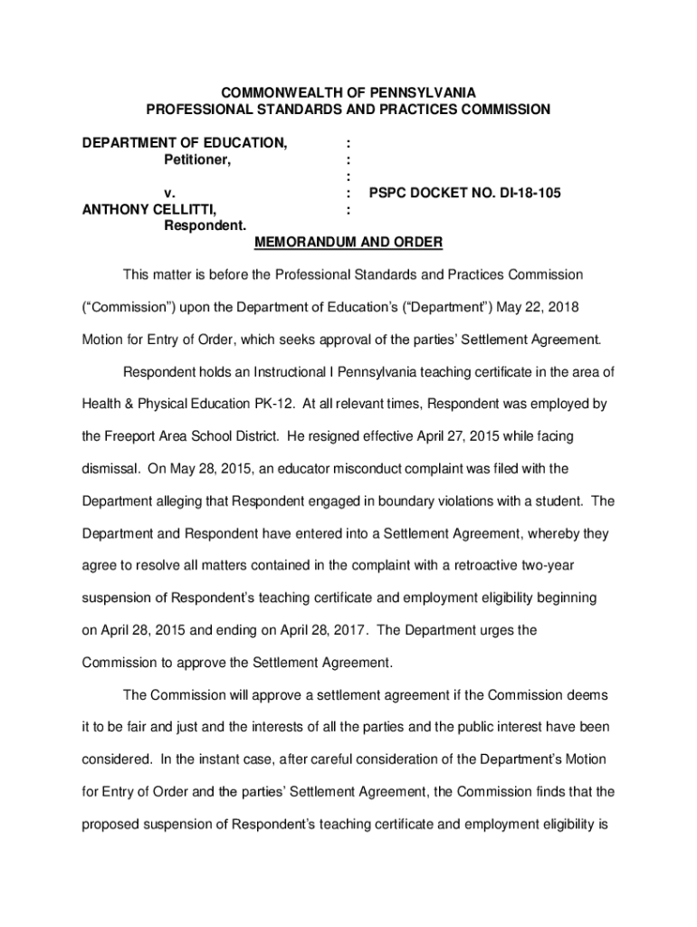 COMMONWEALTH OF PENNSYLVANIA PROFESSIONAL STANDARDS AND PRACTICES COMMISSION DEPARTMENT OF EDUCATION, Petitioner, v. ANTHONY CELLITTI, Respondent.: : : : :PSPC DOCKET NO. DI18105MEMORANDUM AND ORDER