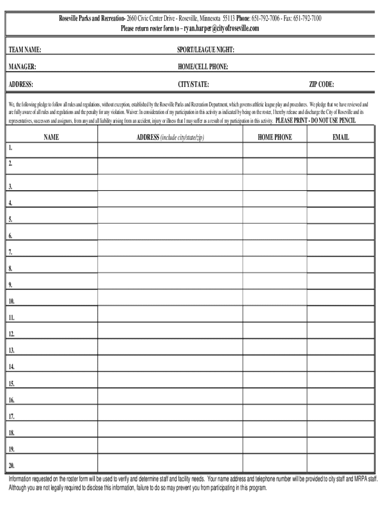 Roseville Parks and Recreation 2660 Civic Center Drive Roseville, Minnesota 55113 Phone: 6517927006 Fax: 6517927100 Please return roster form to ryan.harper@cityofroseville.com TEAM NAME:SPORT/LEAGUE