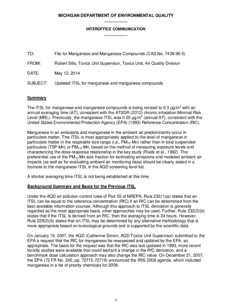___TO:File for Manganese and Manganese Compounds (CAS No. 7439965)FROM:Robert Sills, Toxics Unit Supervisor, Toxics Unit,