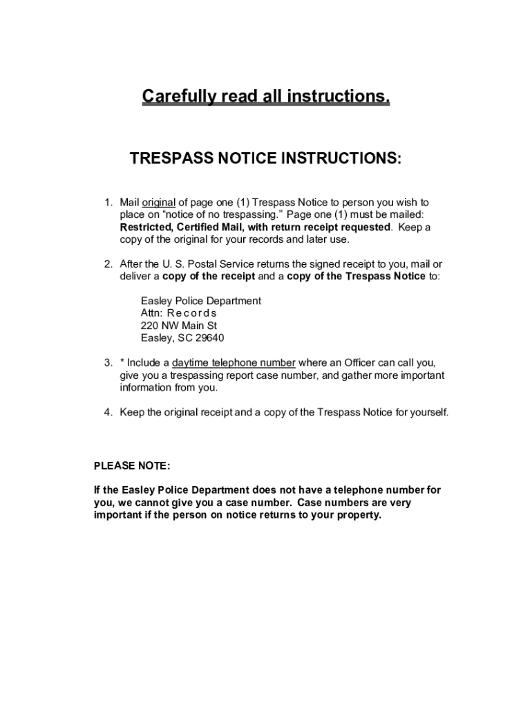 Carefully read all instructions. TRESPASS NOTICE INSTRUCTIONS: 1. Mail original of page one (1) Trespass Notice to person you wish to place on notice of no trespassing. Page one (1) must be mailed: