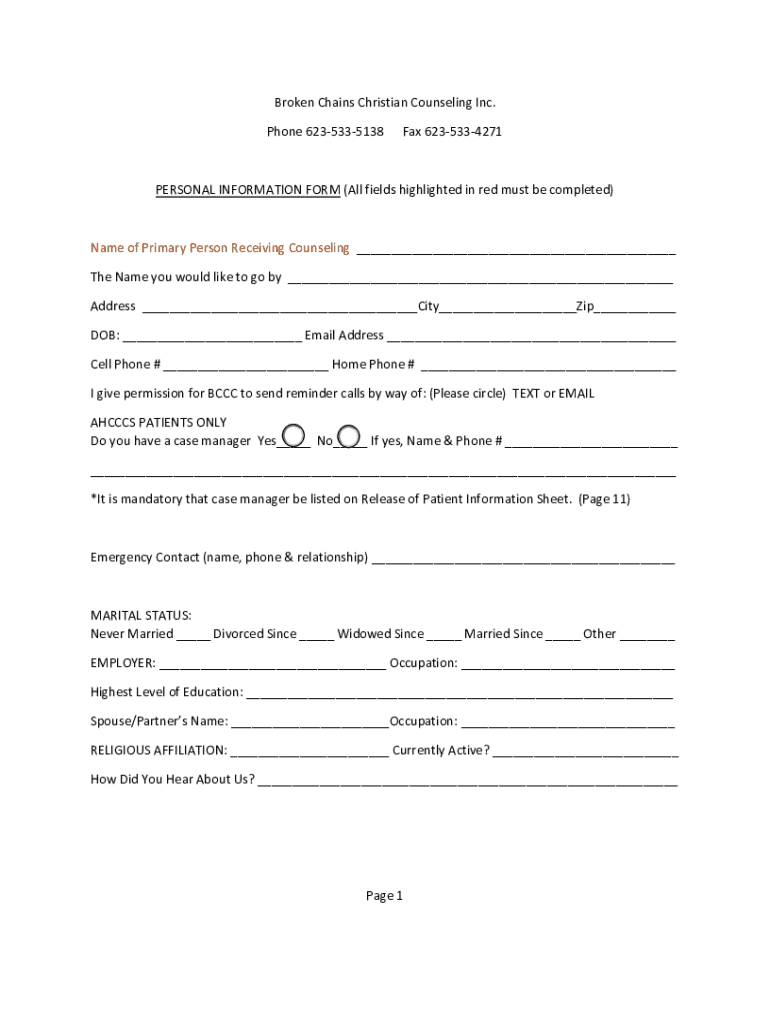 Phone 6235335138Fax 6235334271PERSONAL INFORMATION FORM (All fields highlighted in red must be completed)Name of Primary Person Receiving Counseling ___