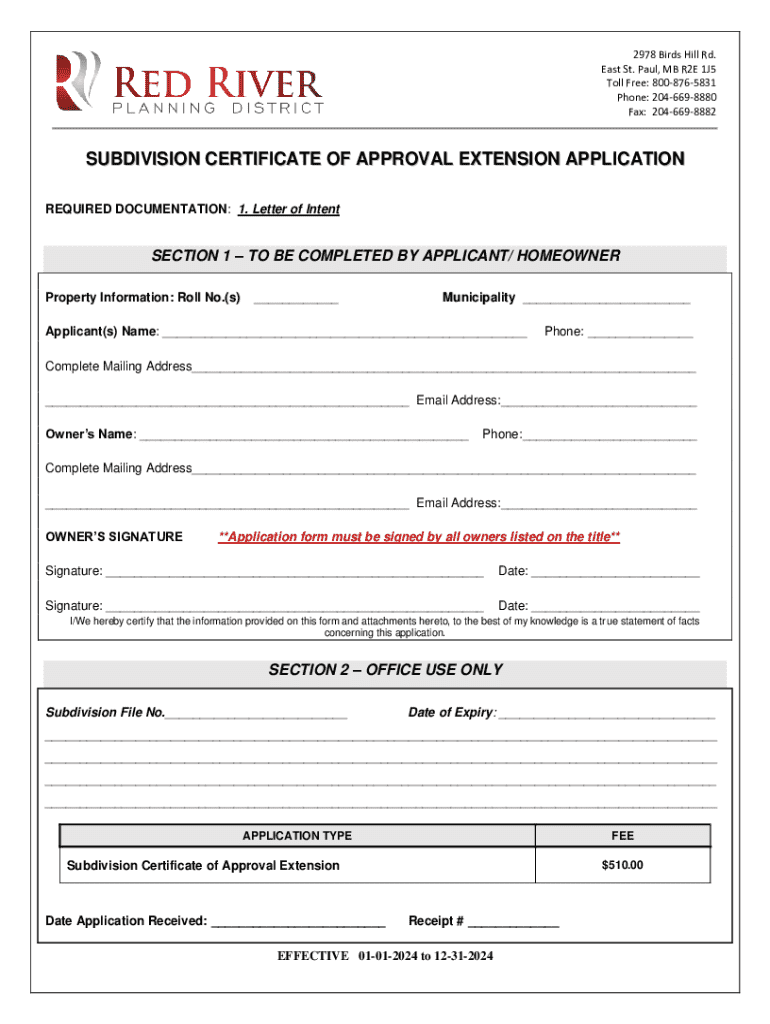 2978 Birds Hill Rd. East St. Paul, MB R2E 1J5 Toll Free: 8008765831 Phone: 2046698880 Fax: 2046698882SUBDIVISION CERTIFICATE OF APPROVAL EXTENSION APPLICATION REQUIRED DOCUMENTATION: 1. Letter of