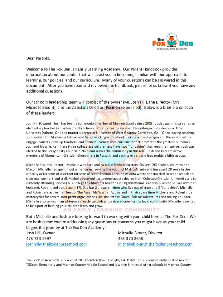Dear Parents: Welcome to The Fox Den, an Early Learning Academy. Our Parent Handbook provides information about our center that will assist you in becoming familiar with our approach to learning,