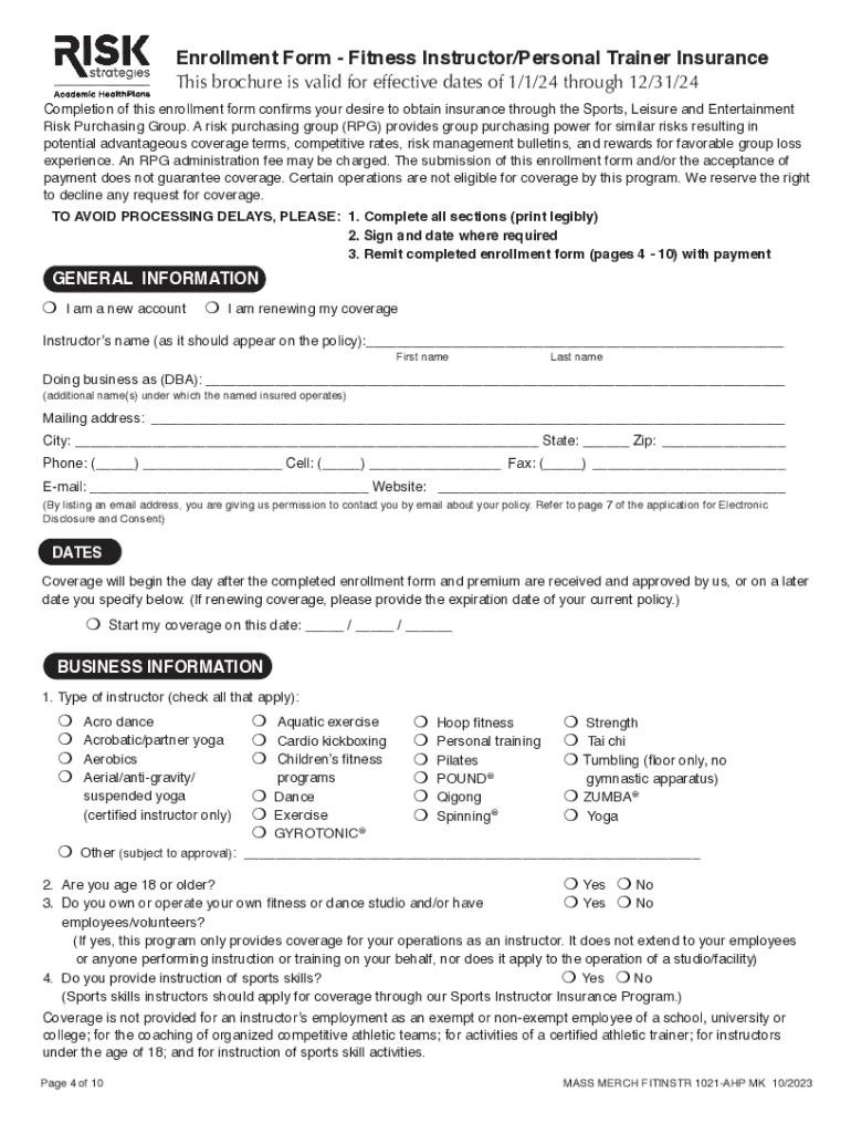 FITNESS INSTRUCTOR/PERSONAL TRAINER Insurance Program and Enrollment FormThis brochure is valid for effective dates of 1/1/24 through 12/31/24 ELIGIBLE OPERATIONSPROGRAM DESCRIPTION This insurance