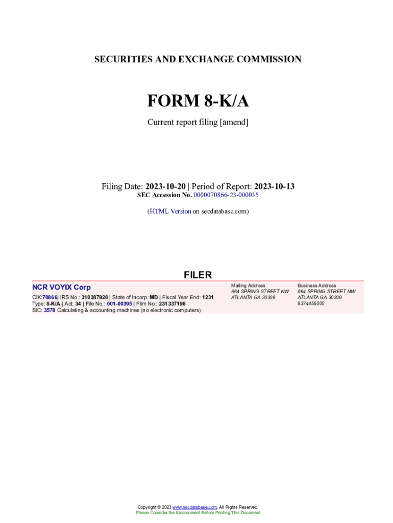 Get the free NCR VOYIX Corp Form 8-K/A Current Event Report Filed 2023-10-20. Accession Number