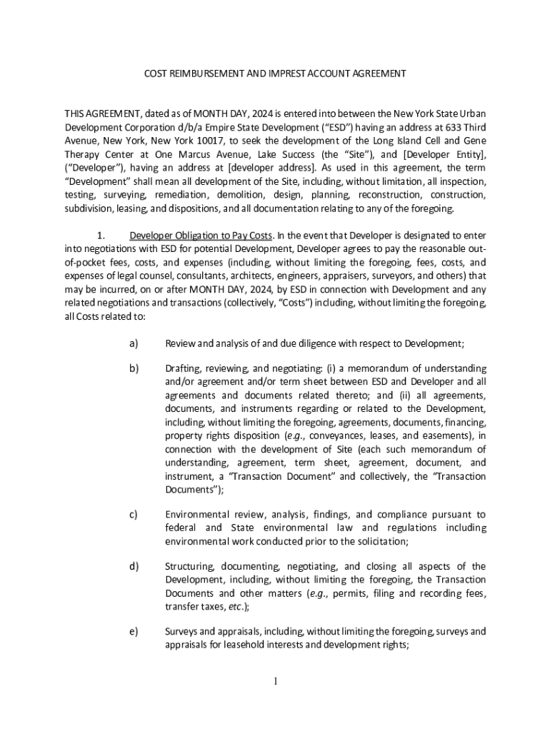 COST REIMBURSEMENT AND IMPRESS ACCOUNT AGREEMENTS AGREEMENT, dated as of MONTH DAY, 2024 is entered into between the New York State Urban